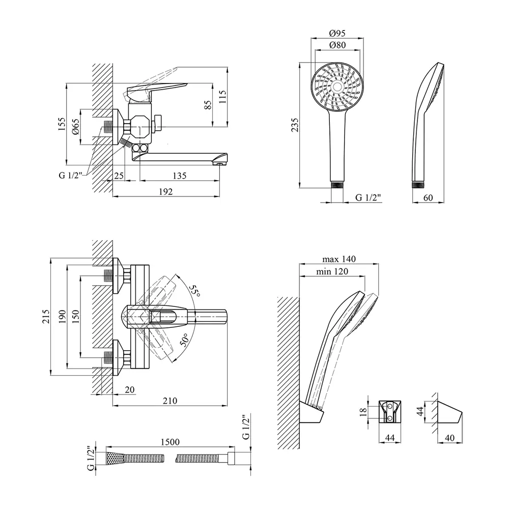 Змішувач, лійка для ручного душу, душовий шланг, кронштейн для ручного душу, кріплення, інструкція.