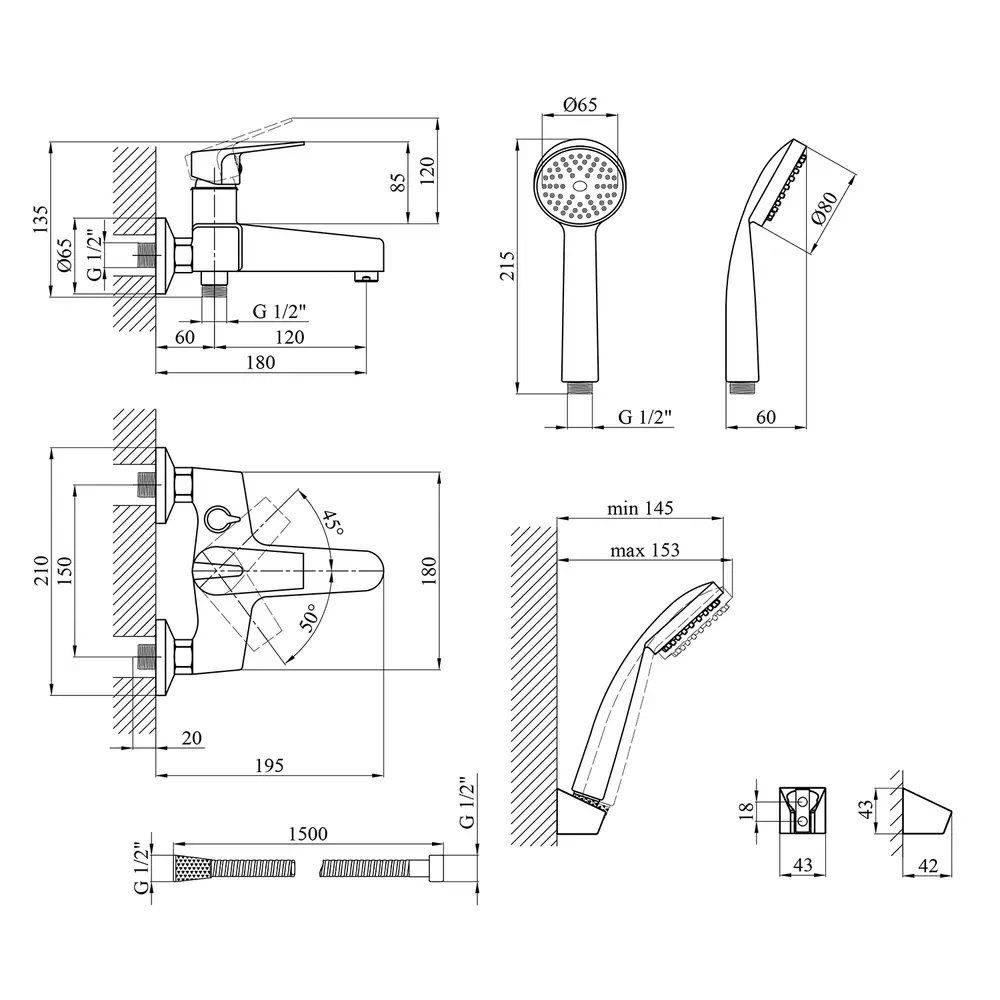 Змішувач, лійка для ручного душу, душовий шланг, кронштейн для ручного душу, кріплення, інструкція.