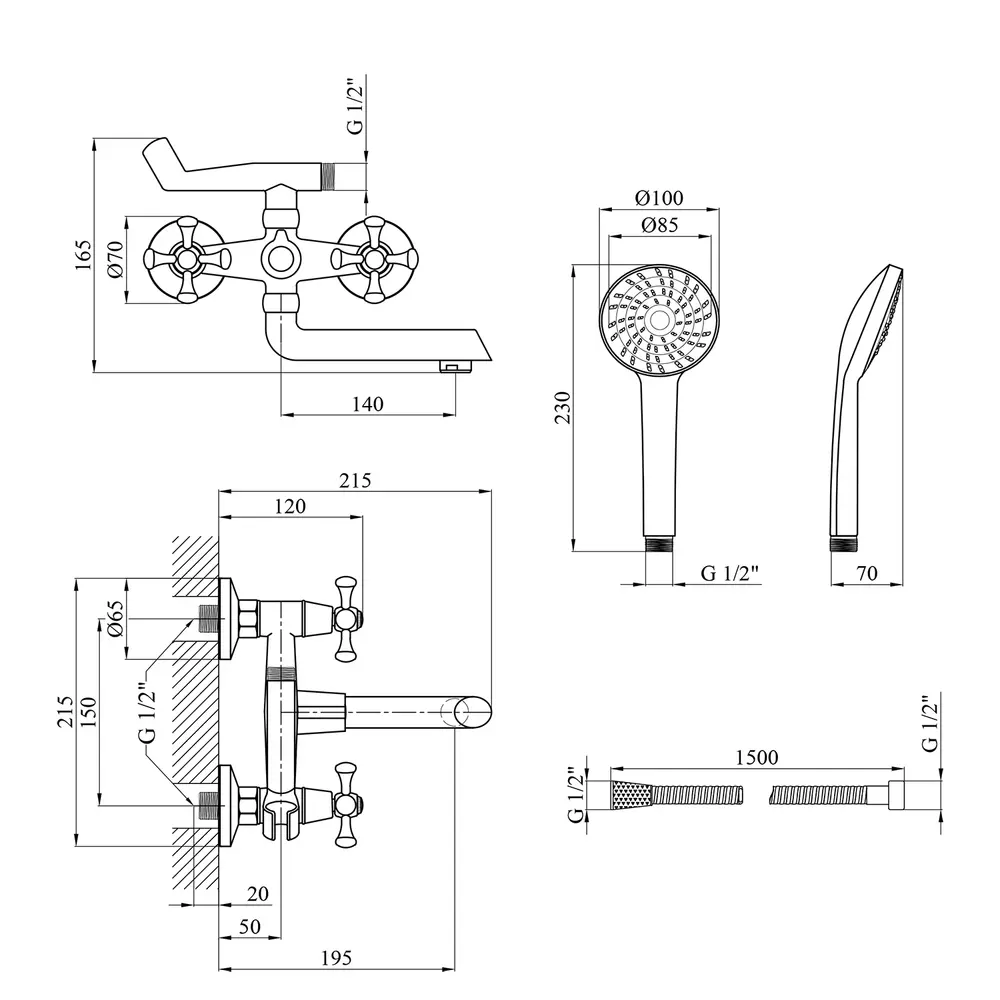Змішувач, лійка для ручного душу, душовий шланг, тримач для ручного душу, кріплення, інструкція.