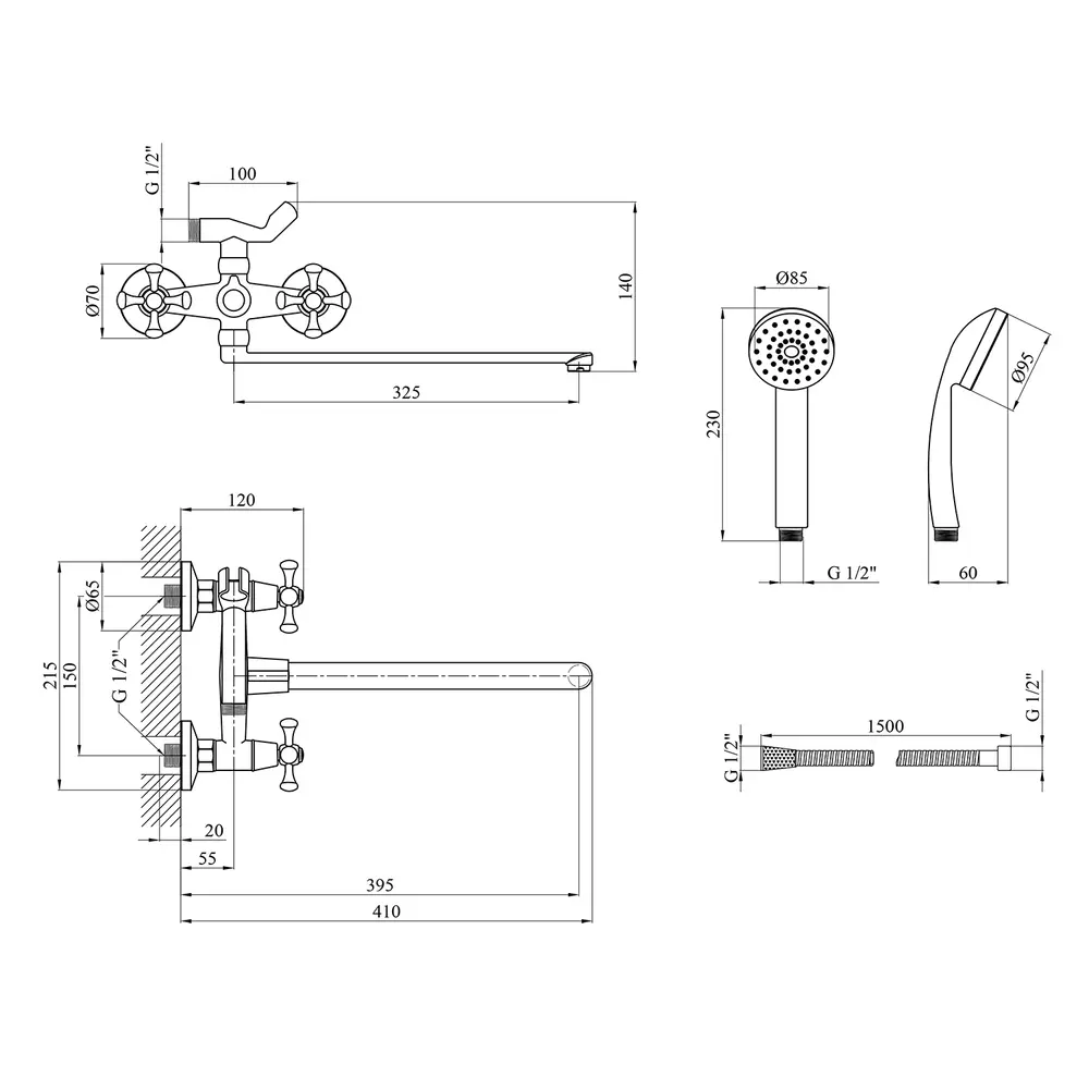 Змішувач, лійка для ручного душу, душовий шланг, тримач для ручного душу, кріплення, інструкція.