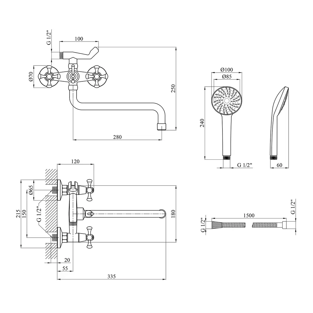 Змішувач, лійка для ручного душу, душовий шланг, тримач для ручного душу, кріплення, інструкція.