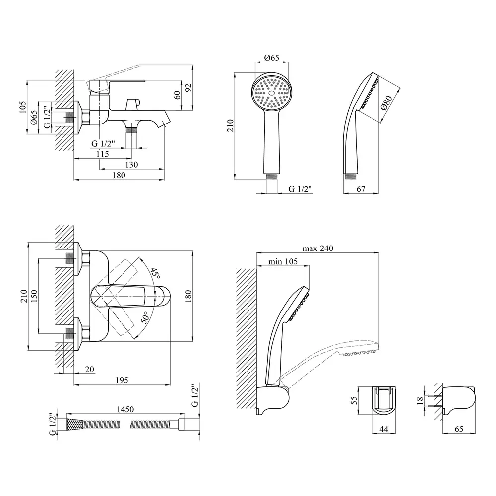 Змішувач, лійка для ручного душу, душовий шланг, кронштейн для ручного душу, кріплення, фум стрічка, інструкція.