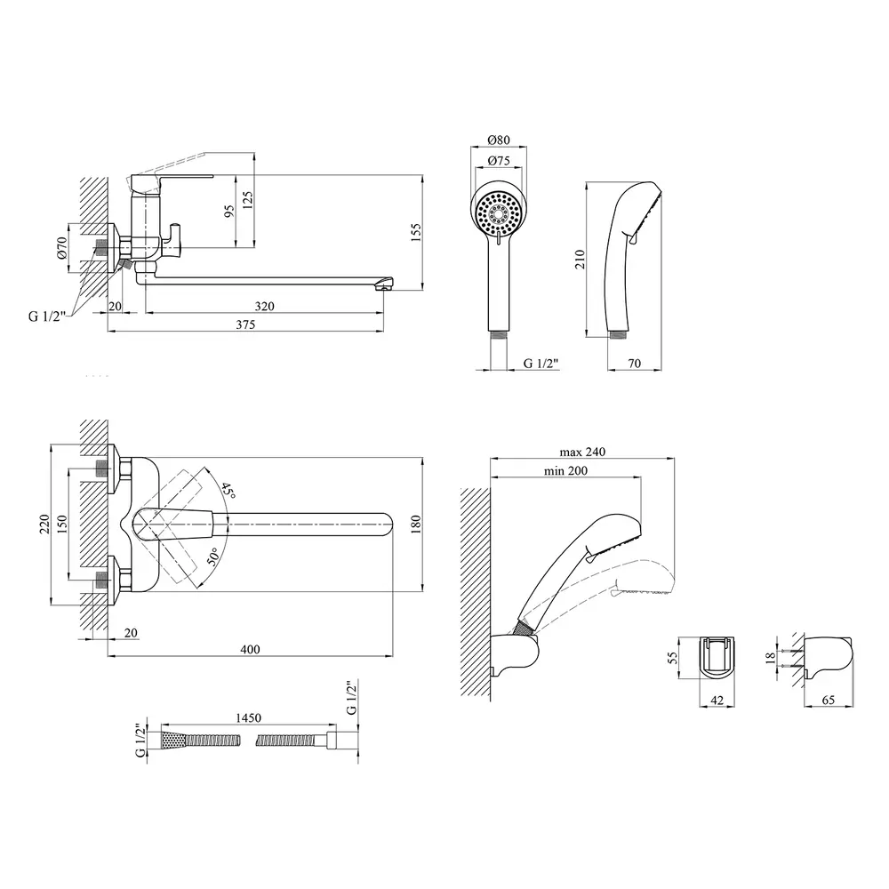 Змішувач, лійка для ручного душу, душовий шланг, кронштейн для ручного душу, кріплення, фум стрічка, інструкція.