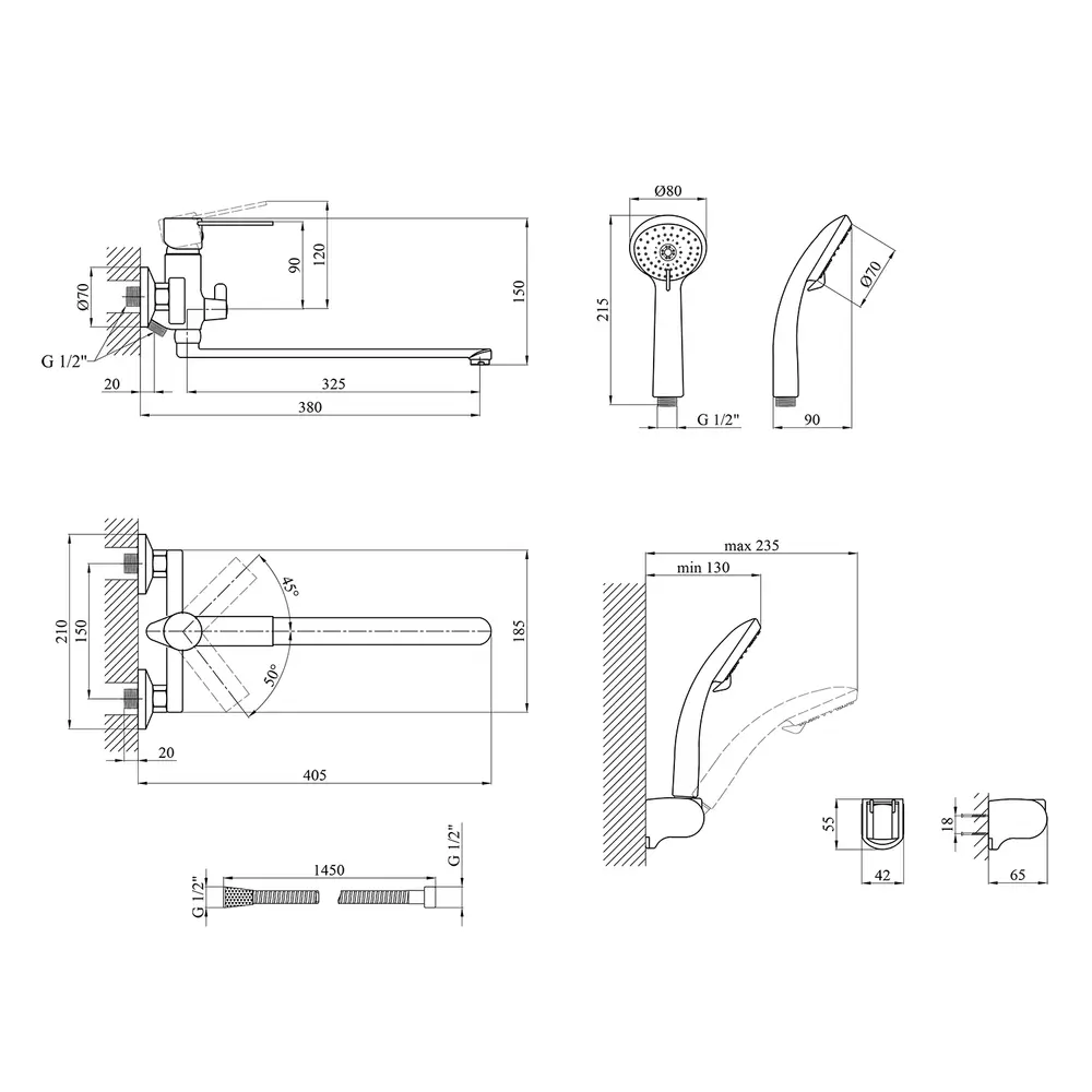 Змішувач, лійка для ручного душу, душовий шланг, кронштейн для ручного душу, кріплення, фум стрічка, інструкція.