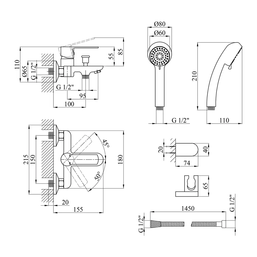 Змішувач, лійка для ручного душу, душовий шланг, тримач для ручного душу, кріплення, інструкція.
