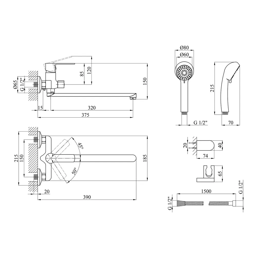 Змішувач, лійка для ручного душу, душовий шланг, тримач для ручного душу, кріплення, інструкція.