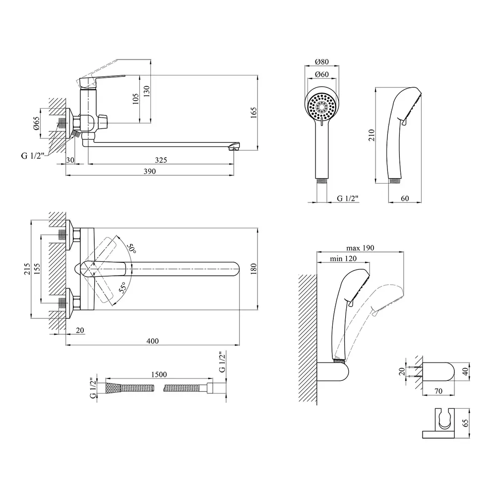 Змішувач, лійка для ручного душу, душовий шланг, кронштейн для ручного душу, кріплення, інструкція.