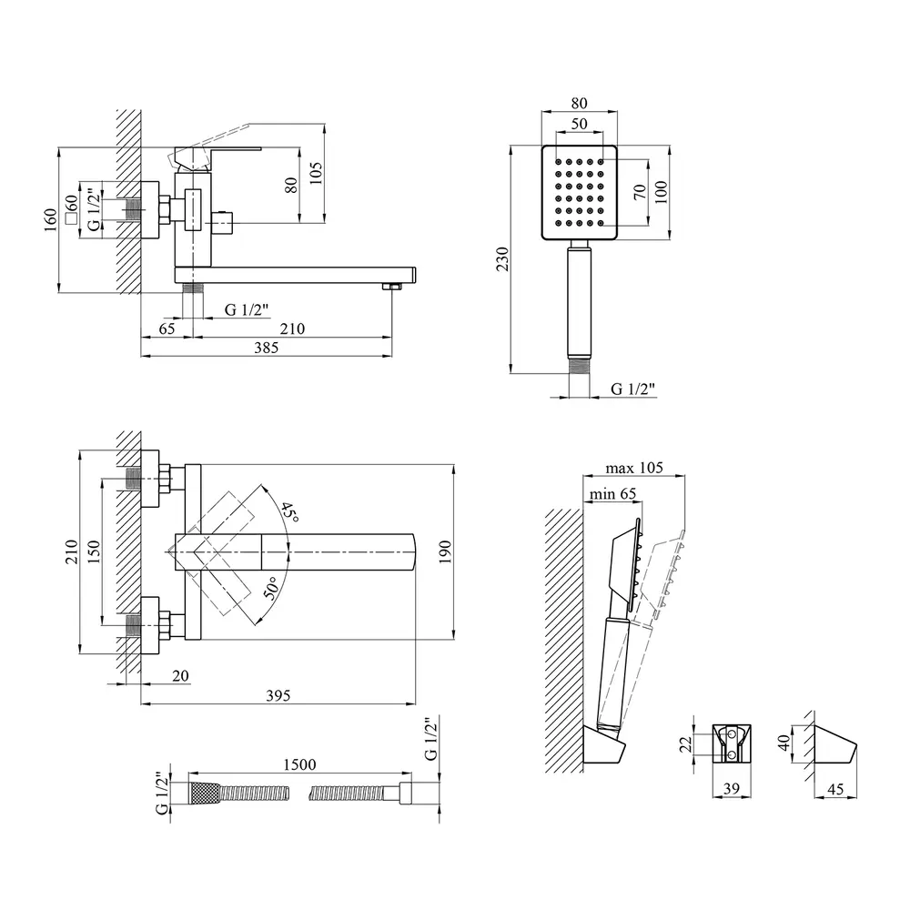 Змішувач, лійка для ручного душу, душовий шланг, кронштейн для ручного душу, кріплення, інструкція.