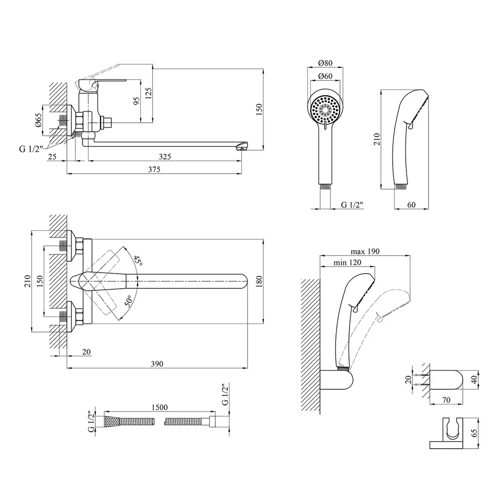 Змішувач, лійка для ручного душу, душовий шланг, кронштейн для ручного душу, кріплення, інструкція.