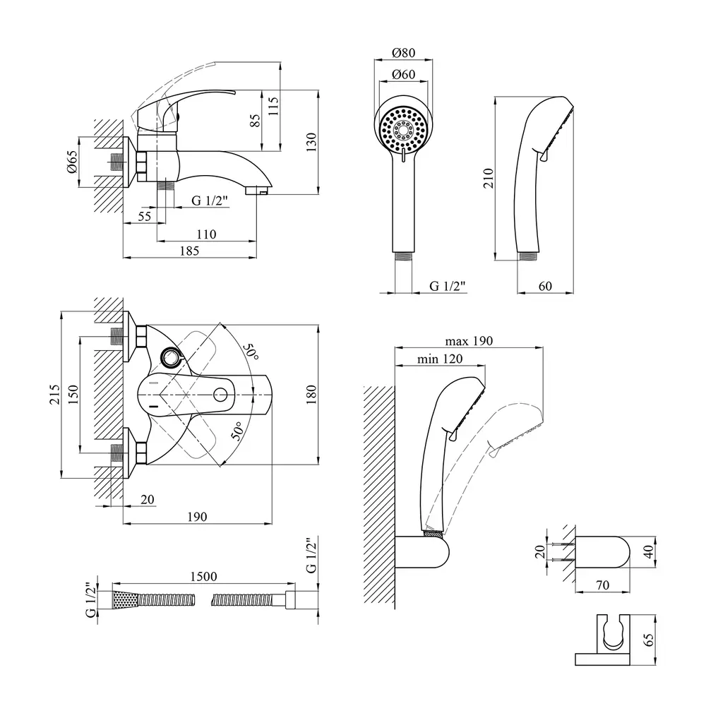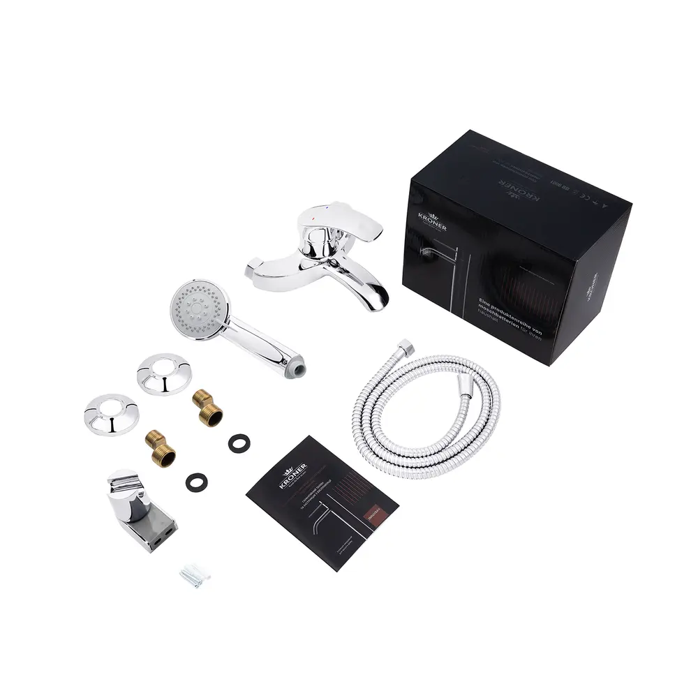 Змішувач, лійка для ручного душу, душовий шланг, кронштейн для ручного душу, кріплення, інструкція.