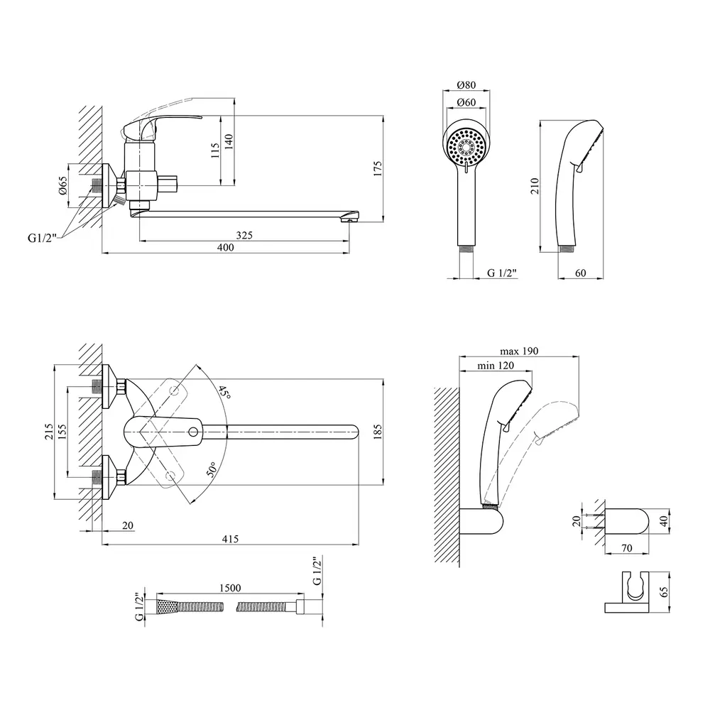 Змішувач, лійка для ручного душу, душовий шланг, кронштейн для ручного душу, кріплення, інструкція.