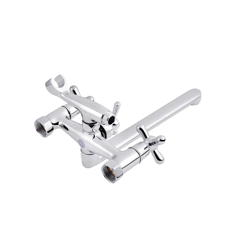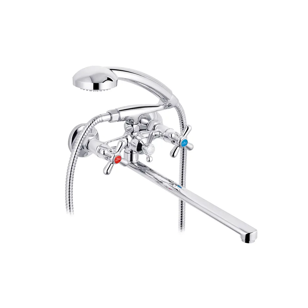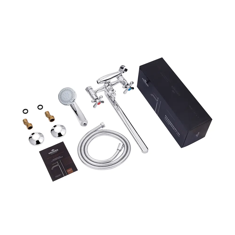 Змішувач для ванни Kroner KRP Royce-C072 з довгим поворотним виливом виготовлено з латуні, укомплектовано душовим шлангом і лійкою. Завдяки хромованому покриттю має міцну поверхню і привабливий зовнішній вигляд. Для включення потоку води передбачено два вентиля. Для перемикання на душ - дивертор. Настінний монтаж здійснюється за допомогою кріпильних деталей, які входять в комплект. Декоративні розетки приховають всі погрішності установки на оздобленні ванної кімнати.