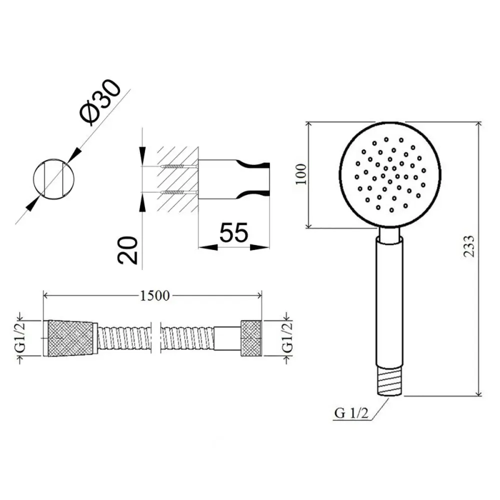 Харчова нержавіюча сталь AISI 304. Діаметр лійки: Ø 100 мм. Довжина душового шланга - 1500 мм. Висота лійки: 233 мм.