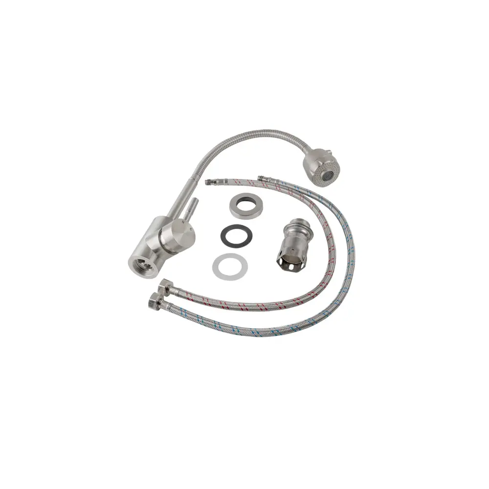 Два шланга длиной 50 см позволяют подключить смеситель к водопроводу с высокой гибкостью. Комплектация включает шланги, крепеж для смесителя, прокладку (2 шт) и гайки, что делает процесс монтажа простым и надежным.