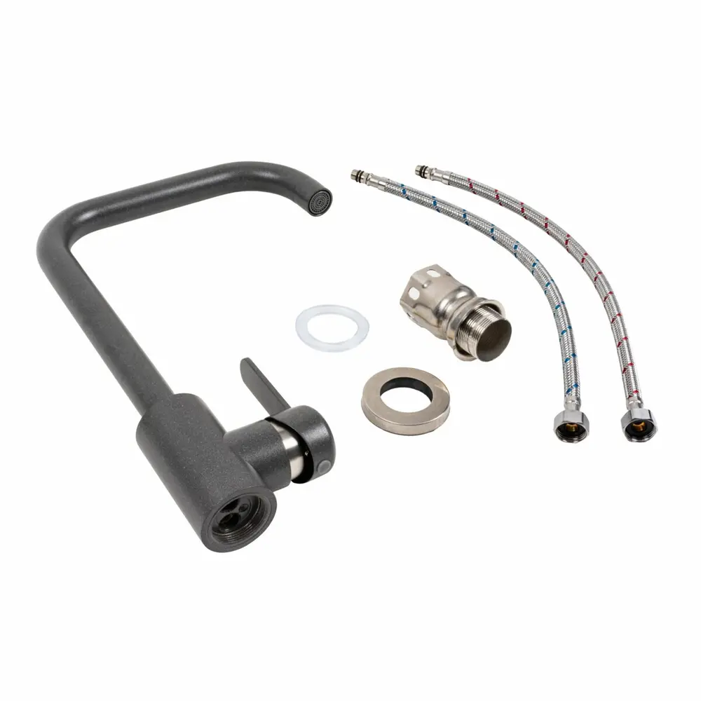 Два шланги довжиною 50 см дозволяють зручно приєднати змішувач до водопроводу. Комплектація включає кріплення для змішувача та прокладки (2 шт), що спрощує монтаж та забезпечує надійну фіксацію.
