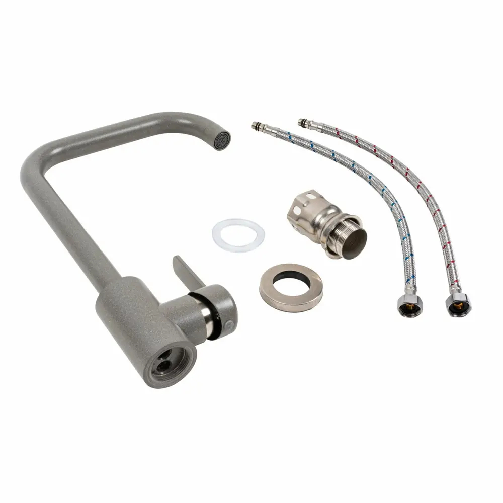 Змішувач Platinum KT 11 Сірий металік має ергономічний дизайн, що дозволяє легко маневрувати водним потоком. Висота змішувача 320 мм та довжина виливу 173 мм роблять його зручним для використання з різними розмірами посуду.Приємний для ока колір- Сірий мусон доповнить вашу мийку .