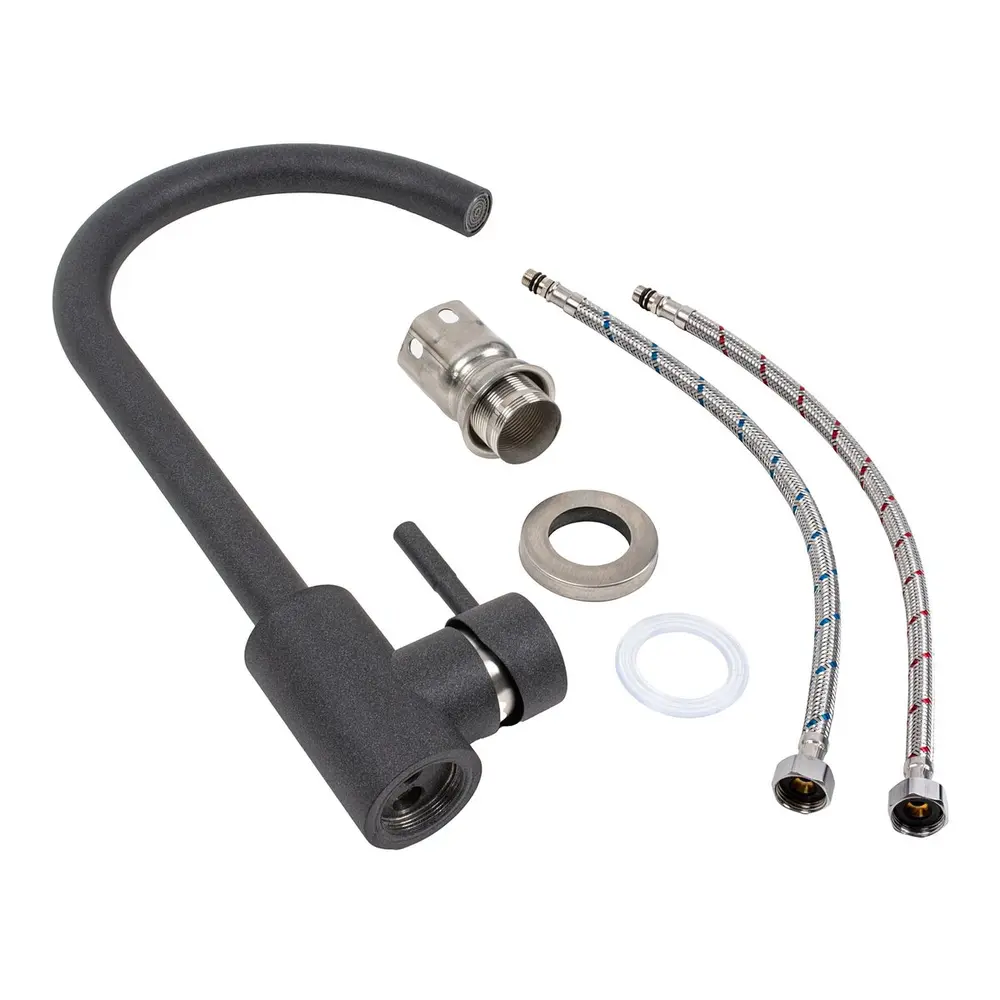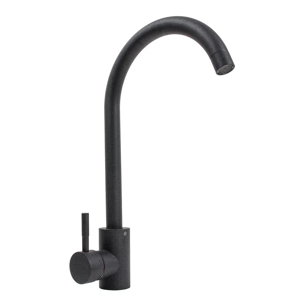Змішувач кухонний Platinum 56 B NESP (3008 А)Карбон відзначається сучасним та стильним дизайном. Він має колір Карбон, який додає елегантності та оригінальності вашій кухні. Його висота складає 330 мм, що робить його ідеальним для використання з великими посудинами та каструлями. Довжина виливу становить 200 мм, що забезпечує зручність при наповненні горщиків та митті посуду. Змішувач виготовлений з високоякісної нержавіючої сталі SUS304, що гарантує його тривалий термін служби та стійкість до корозії.