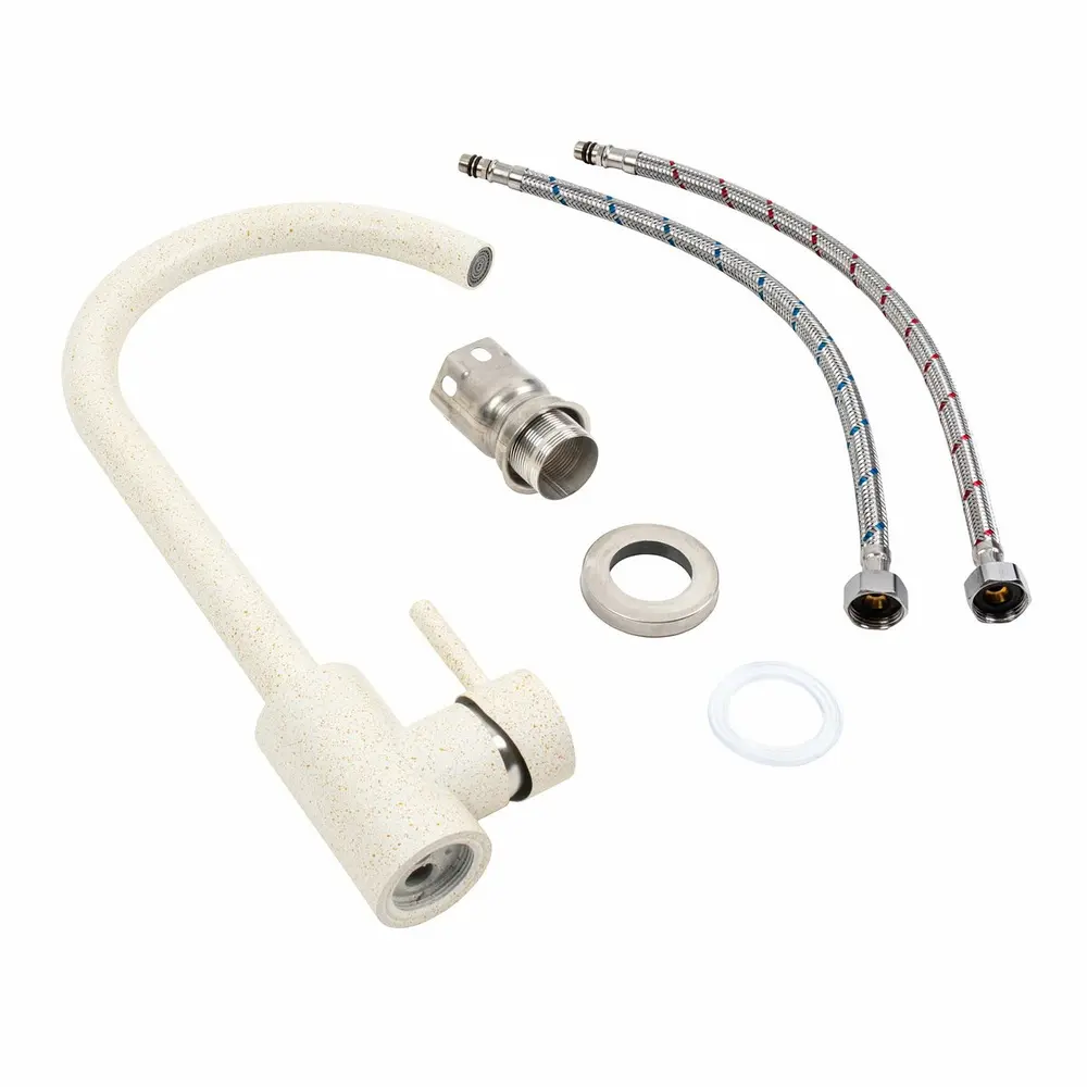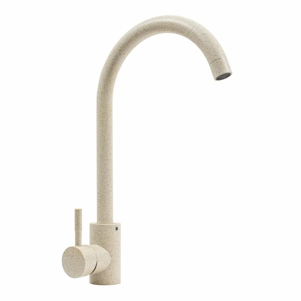Змішувач кухонний Platinum 56 B NESP (3008 А)Пісок відзначається сучасним та стильним дизайном. Він має колір Пісок, який додає елегантності та оригінальності вашій кухні. Його висота складає 330 мм, що робить його ідеальним для використання з великими посудинами та каструлями. Довжина виливу становить 200 мм, що забезпечує зручність при наповненні горщиків та митті посуду. Змішувач виготовлений з високоякісної нержавіючої сталі SUS304, що гарантує його тривалий термін служби та стійкість до корозії.