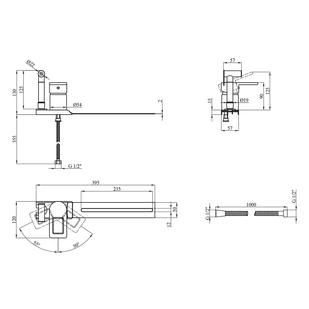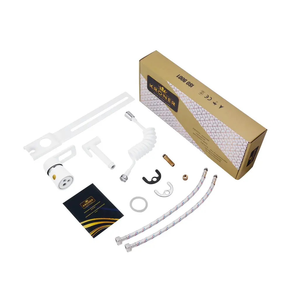Змішувач, душовий шланг, лійка для гігієнічного душу, рейка, кріплення, інструкція.