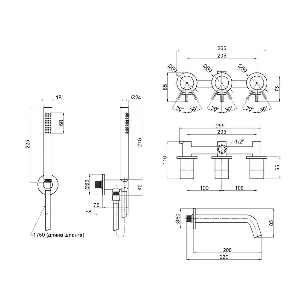 Змішувач прихованого монтажу, душовий шланг, лійка для ручного душу, тримач для ручного душу, кріпильні деталі.