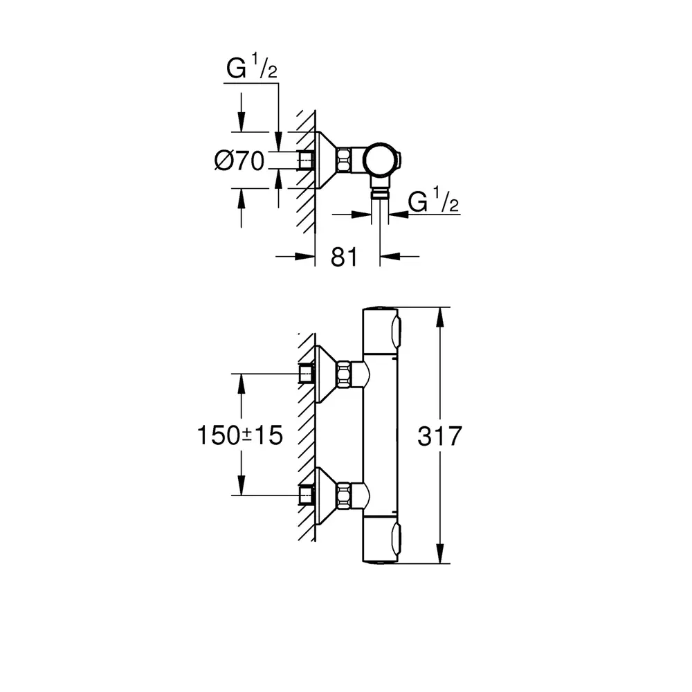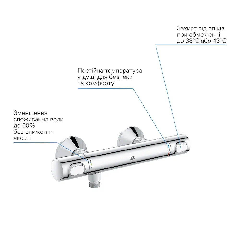 Смеситель термостатический для душа Grohe QuickFix Precision Flow 34840000 имеет хромированную глянцевую поверхность, устойчивую к образованию коррозии, загрязнениям и истиранию. Корпус изготовлен из латуни. Это гарантирует длительный срок эксплуатации изделия. Для включения подачи воды и регулировки температуры смеситель оснащен двумя вентилями, делающими процесс настройки температуры и напора воды простым и интуитивно понятным. Смеситель оснащен дополнительным ограничителем температуры GROHE SafeStop Plus, благодаря которому можно настроить ограничения до 43°C для дополнительного уровня безопасности. А при полном отказе подачи холодной воды автоматическое защитное отключение снижает расход воды до минимума.