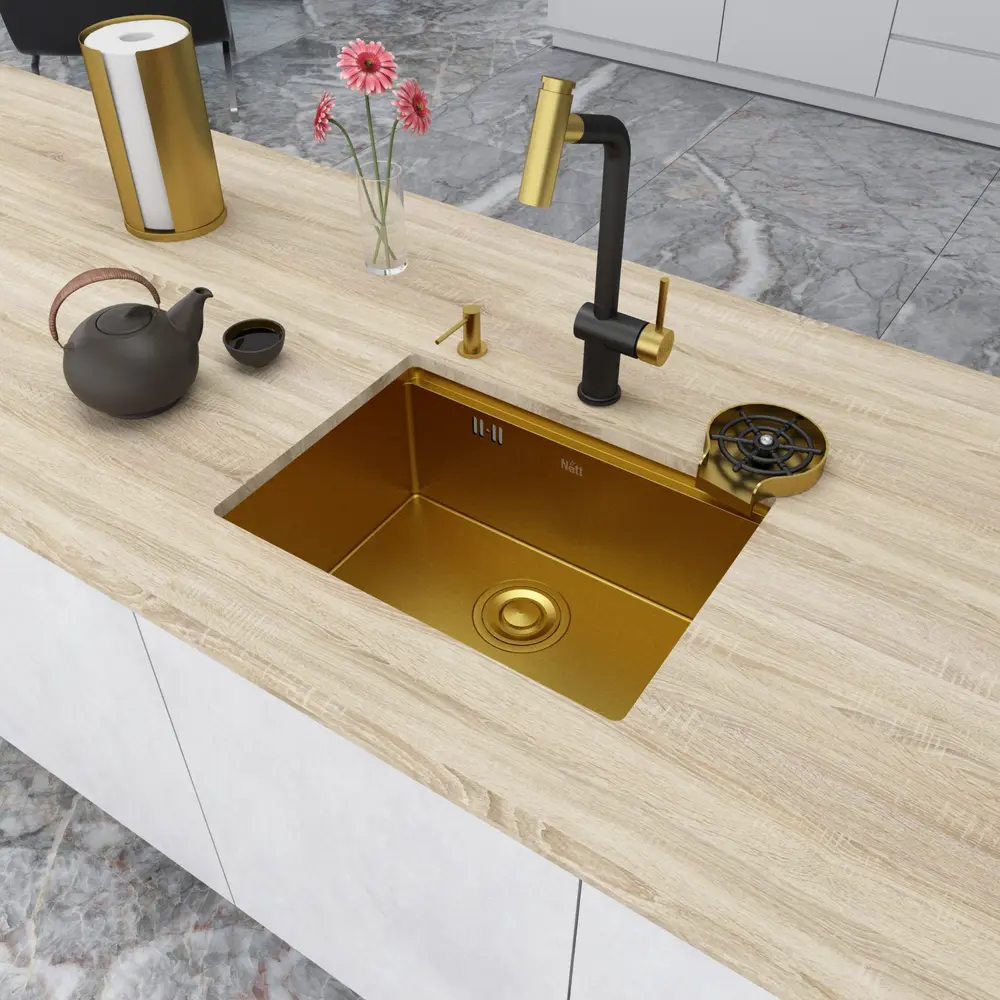 Розгляньте можливість вибору врізної мийки із золотим Nano-покриттям, яке продовжить захищати метал навіть при випадкових пошкодженнях.